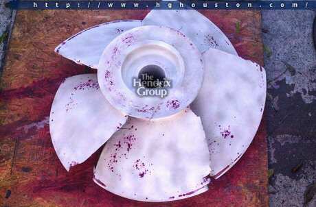 Nickel aluminum bronze pump impeller after dye-penetrant inspection. The red dye represents areas of surface voids.